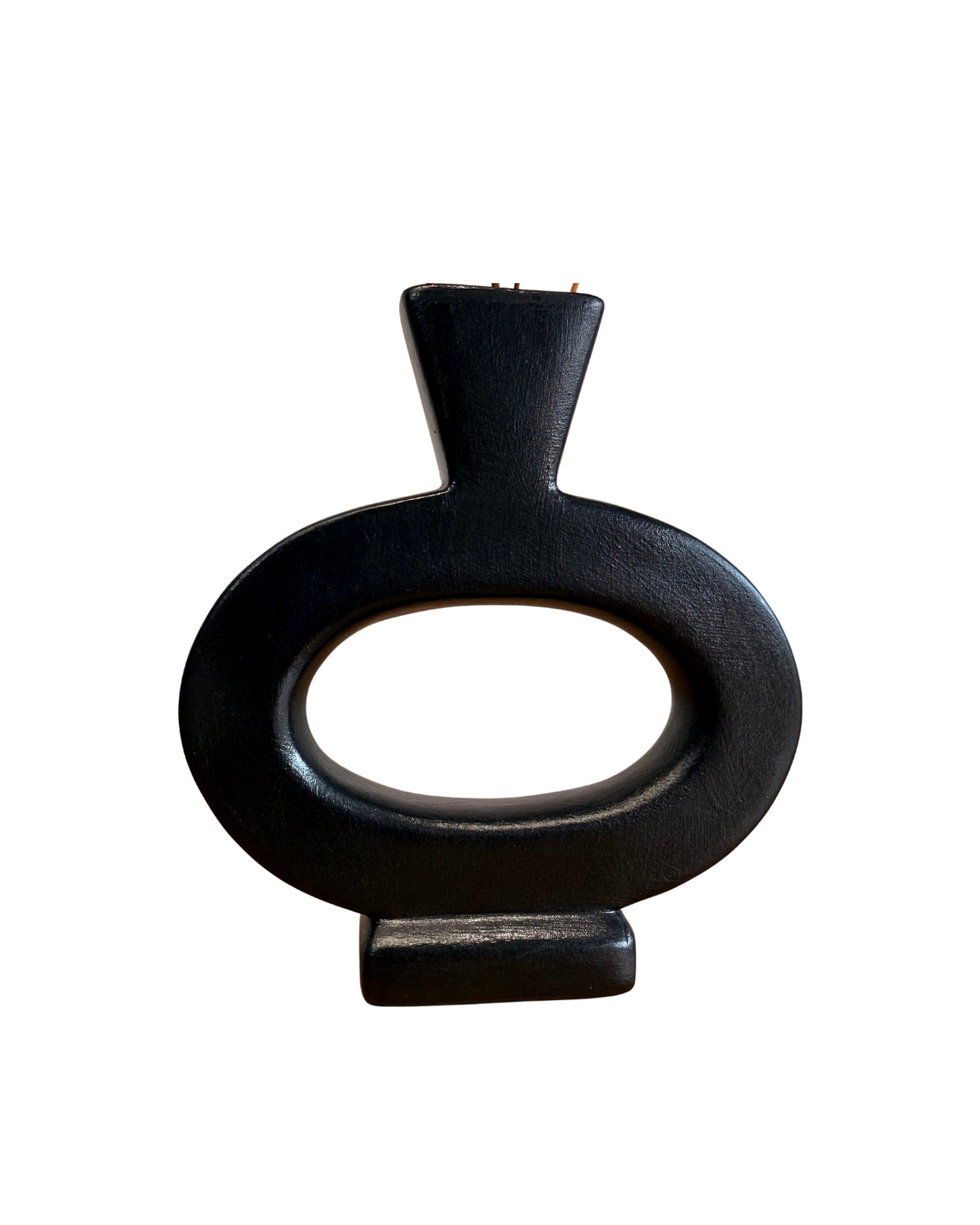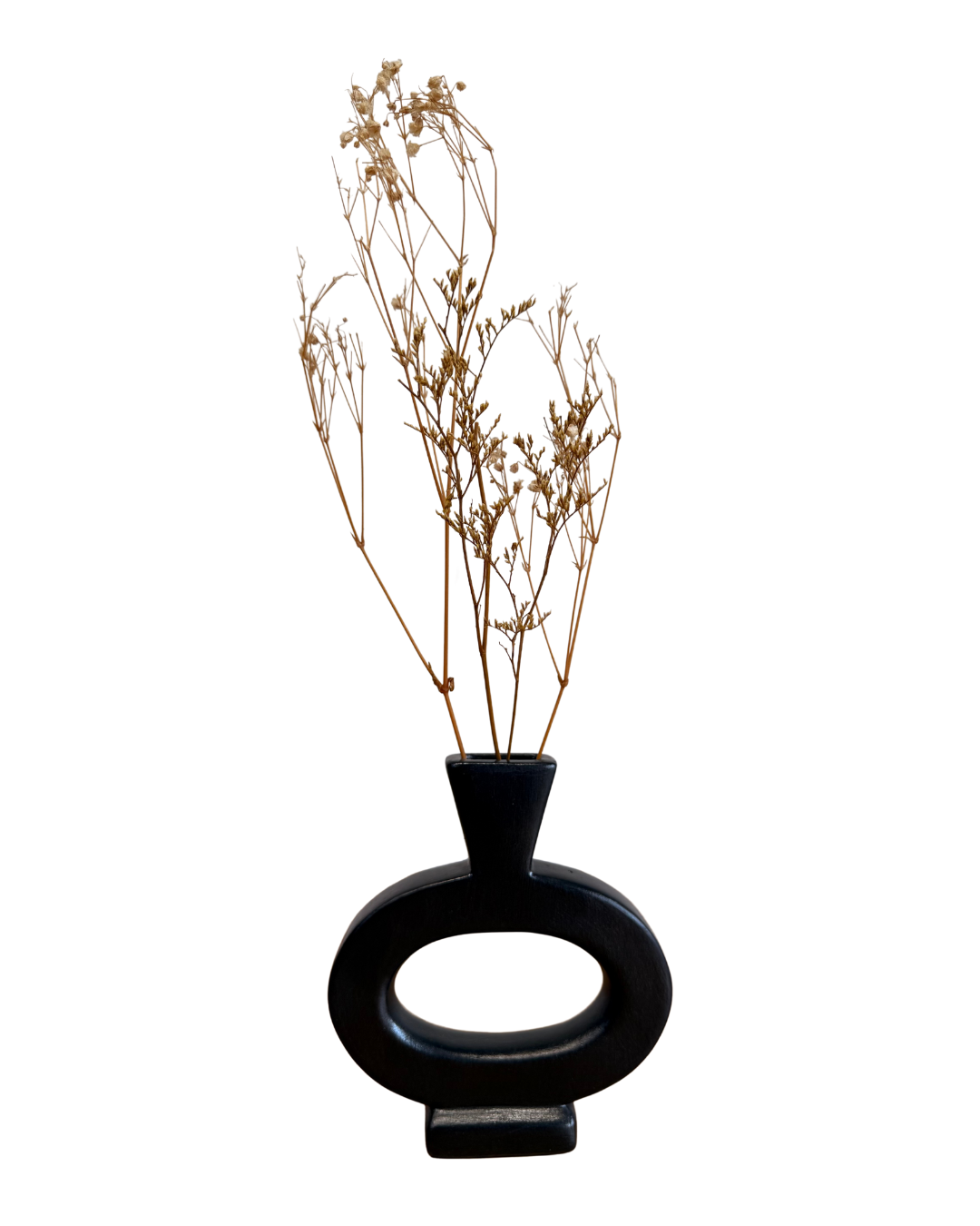 Agrega elegancia y carácter a tus espacios con este florero de diseño escultórico y estilo moderno, en color negro con un acabado brillante que resalta su sofisticación.