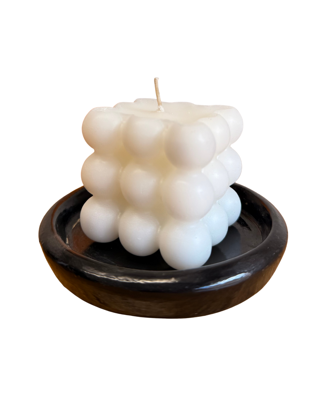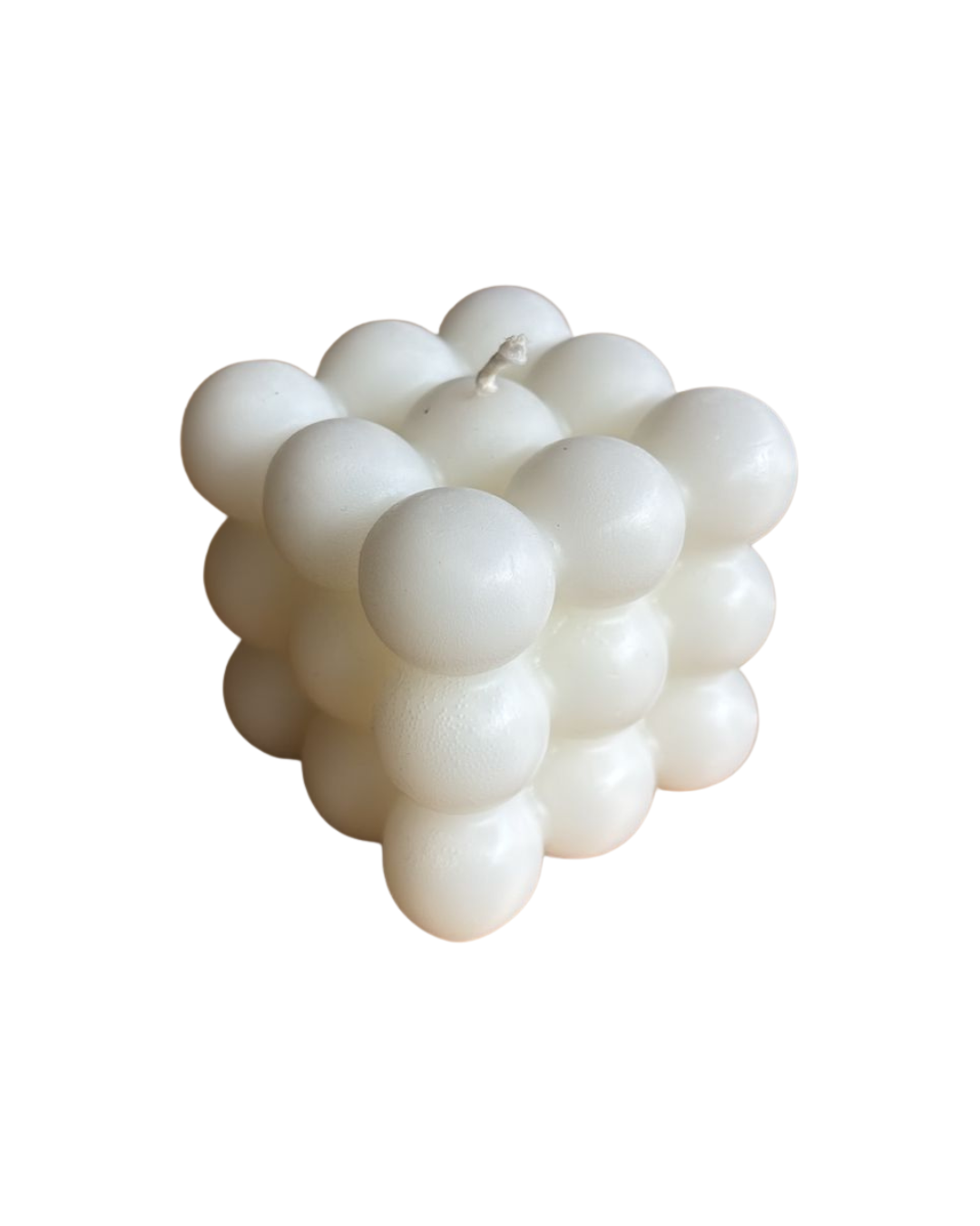 Vela en cera color blanco con forma cúbica compuesta por esferas. Medidas: alto 6cm, ancho 6cm (aproximadamente).